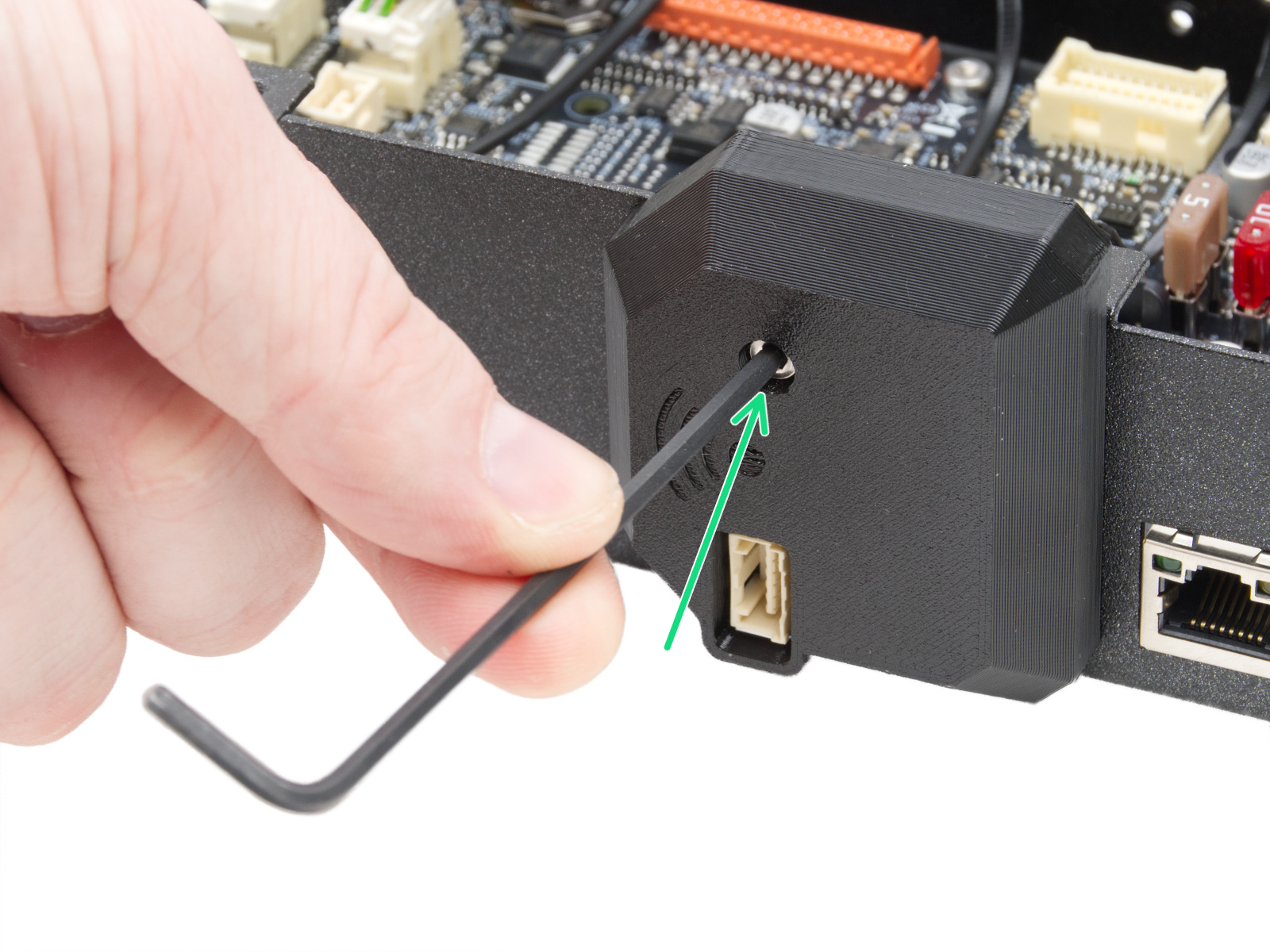 Locate the Wi-Fi module on the rear panel of the printer. Using a 2.5 mm Allen key, remove the M3x14 screw. Gently pull the Wi-Fi module straight downward to remove it from the printer. Note that the Wi-Fi module is connected to the electronics with eight spikes.