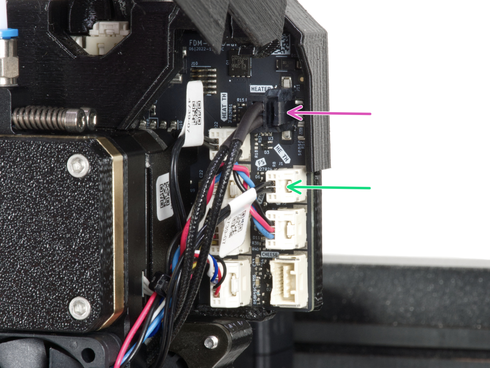 Check that all the connectors are secure in their sockets, according to the picture below. Focus on the thermistor and heater cables. Though unlikely, rough shipping or handling could have shaken the heater or thermistor cables loose.