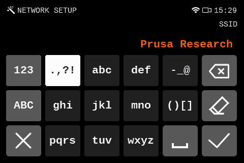 Přihlašovací údaje k síti Wi-Fi je možné zadat ručně pomocí dotykové obrazovky tiskárny. Vzhledem k omezenému prostoru na obrazovce má klávesnice na dotykové obrazovce rozložení podobné hardwarové klávesnici na starých telefonech.