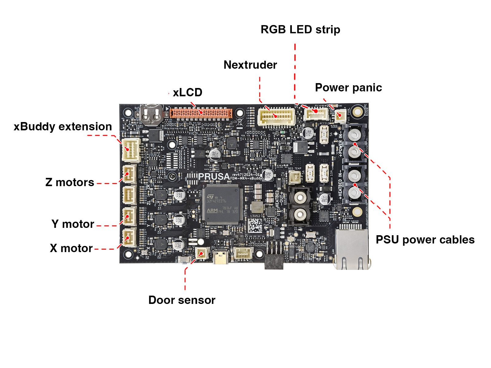 The Prusa CORE One L is equipped with multiple electronic boards. The slots on the electronic boards have a label near them indicating the component to connect to each slot.
