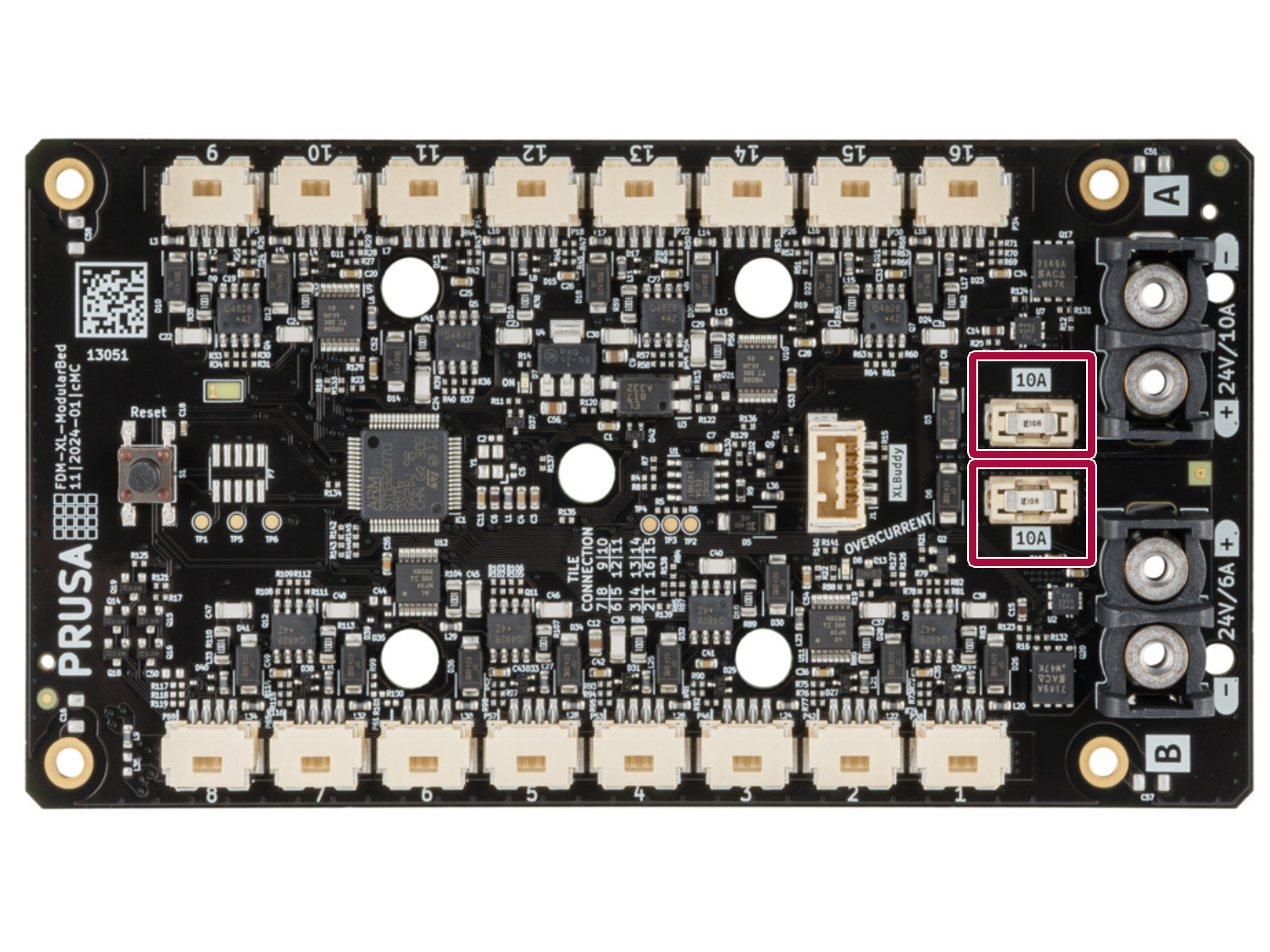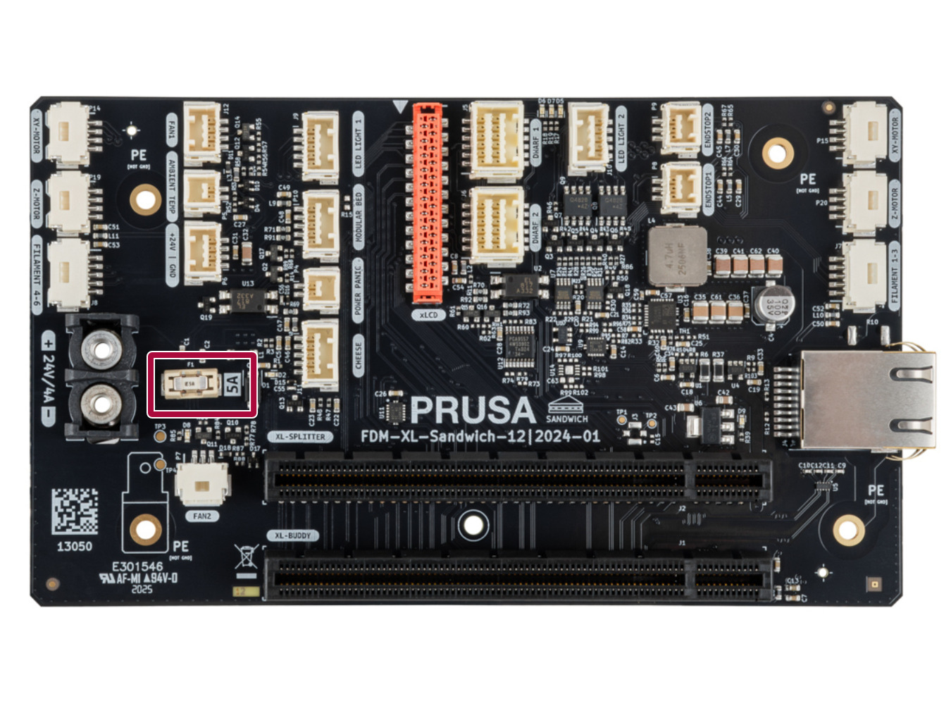 Die Original Prusa XL Elektronik ist mit Sicherungen ausgestattet, um wichtige Bauteile zu schützen. Wenn Ihr Drucker oder einige seiner Komponenten plötzlich nicht mehr funktionieren, ist es empfehlenswert, diese Sicherungen zu überprüfen und gegebenenfalls zu ersetzen.