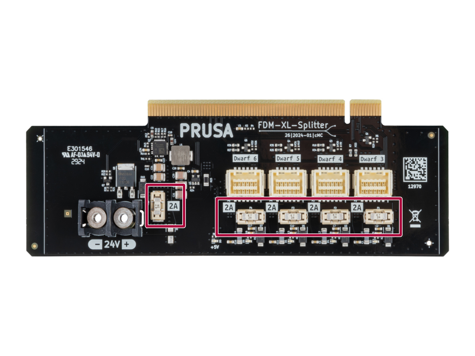 Die XL-Splitter-Platine für den 5 Toolhead XL ist mit fünf 2A Sicherungen ausgestattet.