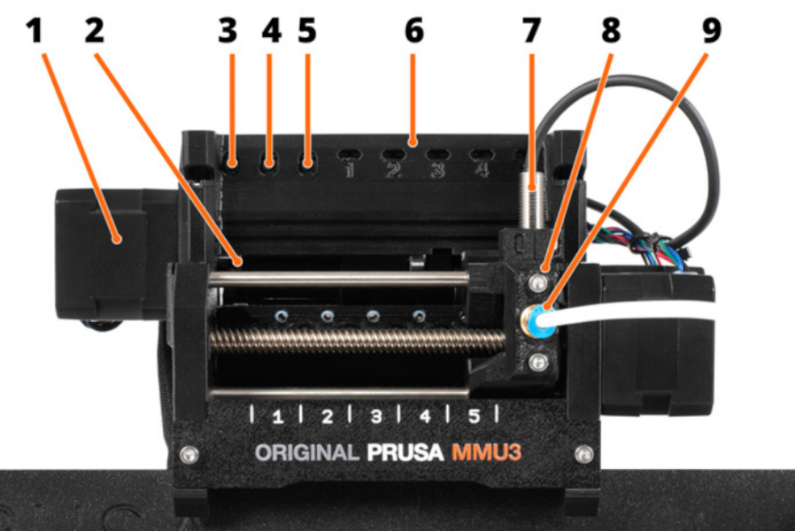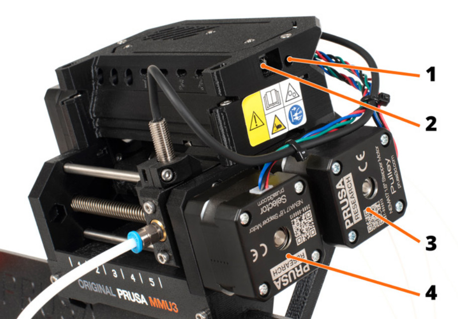 - Selektor - wählt einen Filament-Slot aus, indem er auf die gewünschte Position bewegt wird. Das Filament wird dann vom Pulley Motor durch den Selektor in die Düse geschoben.