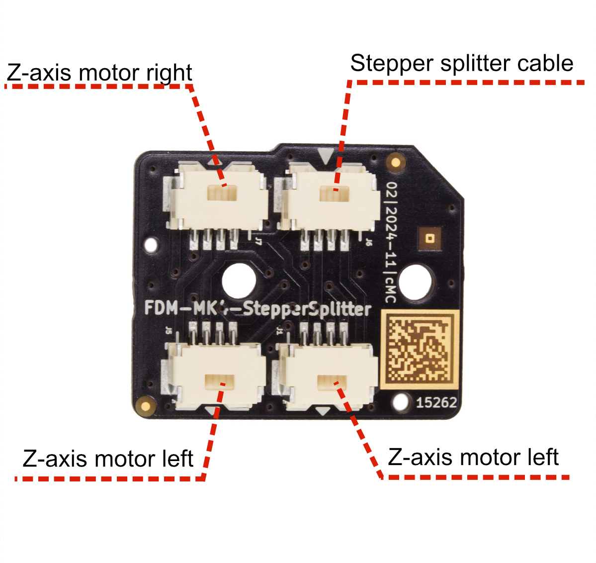 Der Prusa CORE One ist mit mehreren Elektronikplatinen ausgestattet. Die Steckplätze auf den Elektronikplatinen sind mit einer Beschriftung versehen, die angibt, welche Komponente an den jeweiligen Steckplatz angeschlossen werden muss.