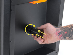 ⬢Attach the sheet by first aligning the rear cutout with the locking pins on the back of the heated bed. Hold the sheet by the front two corners and slowly lay it down onto the heated bed - watch your fingers!