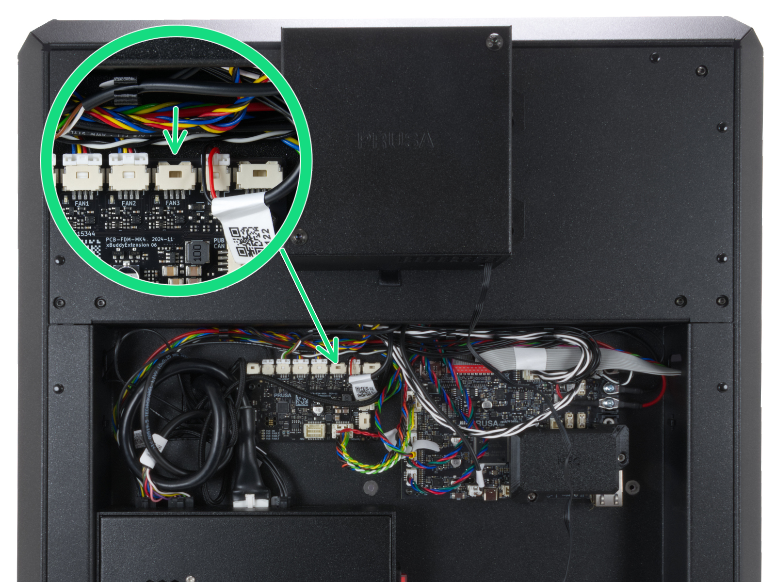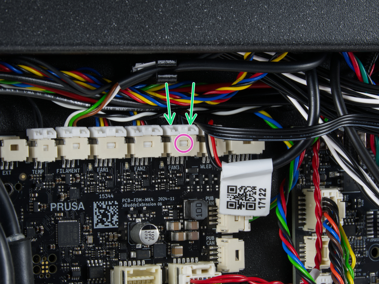 Se disattivare la filtrazione della camera dal menu della stampante non risolve il problema, con la stampante spenta e fredda, controlla se un altro componente, tipo una delle ventole della camera, potrebbe essere collegato erroneamente al connettore FAN3 sulla scheda xBuddy. Segui i passaggi del capitolo precedente per accedere alla scheda xBuddy sulla tua stampante.