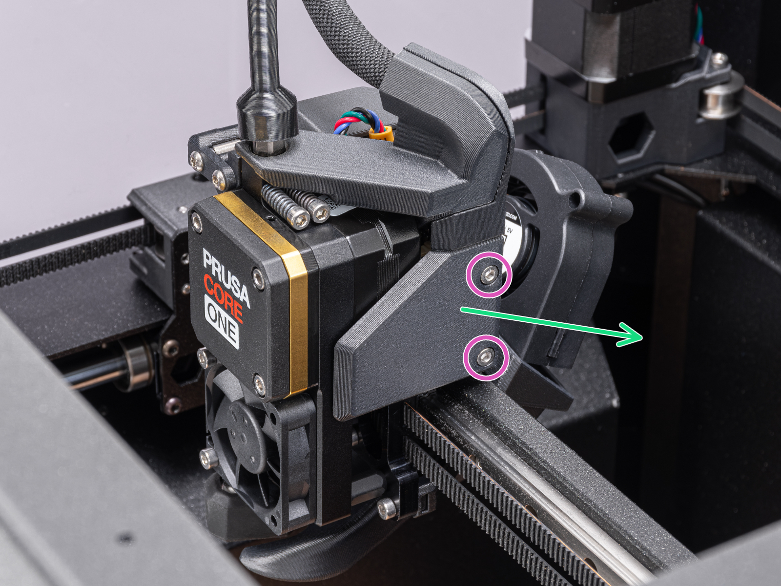 - Po prawej stronie Nextrudera wykręć śrubę dwie śruby M3 mocujące prawą pokrywę głowicy [Print-head-cover-right].