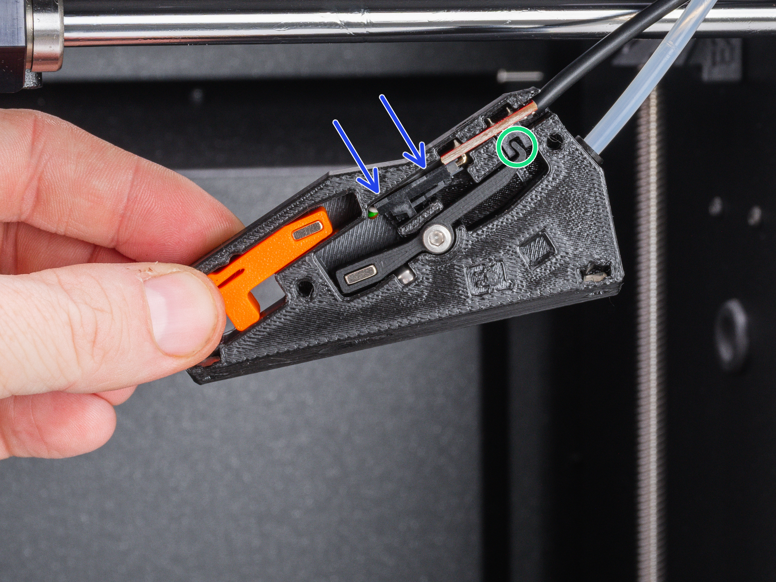 - Zaawansowany boczny czujnik filamentu wyposażony w fizyczny przełącznik, który zapewnia niezawodne i bezproblemowe podawanie filamentów TPU.