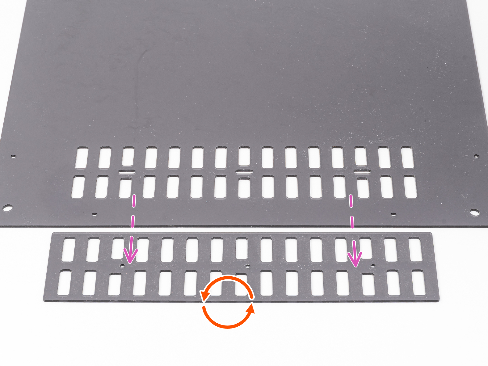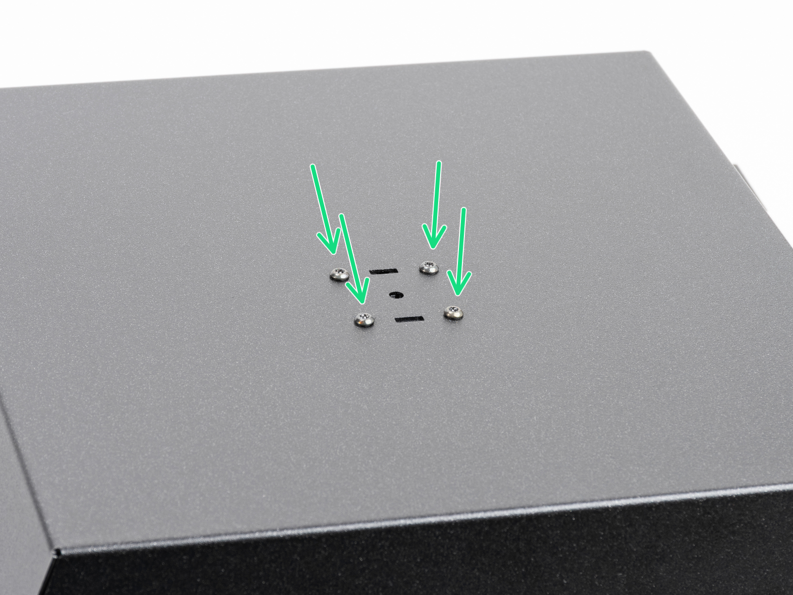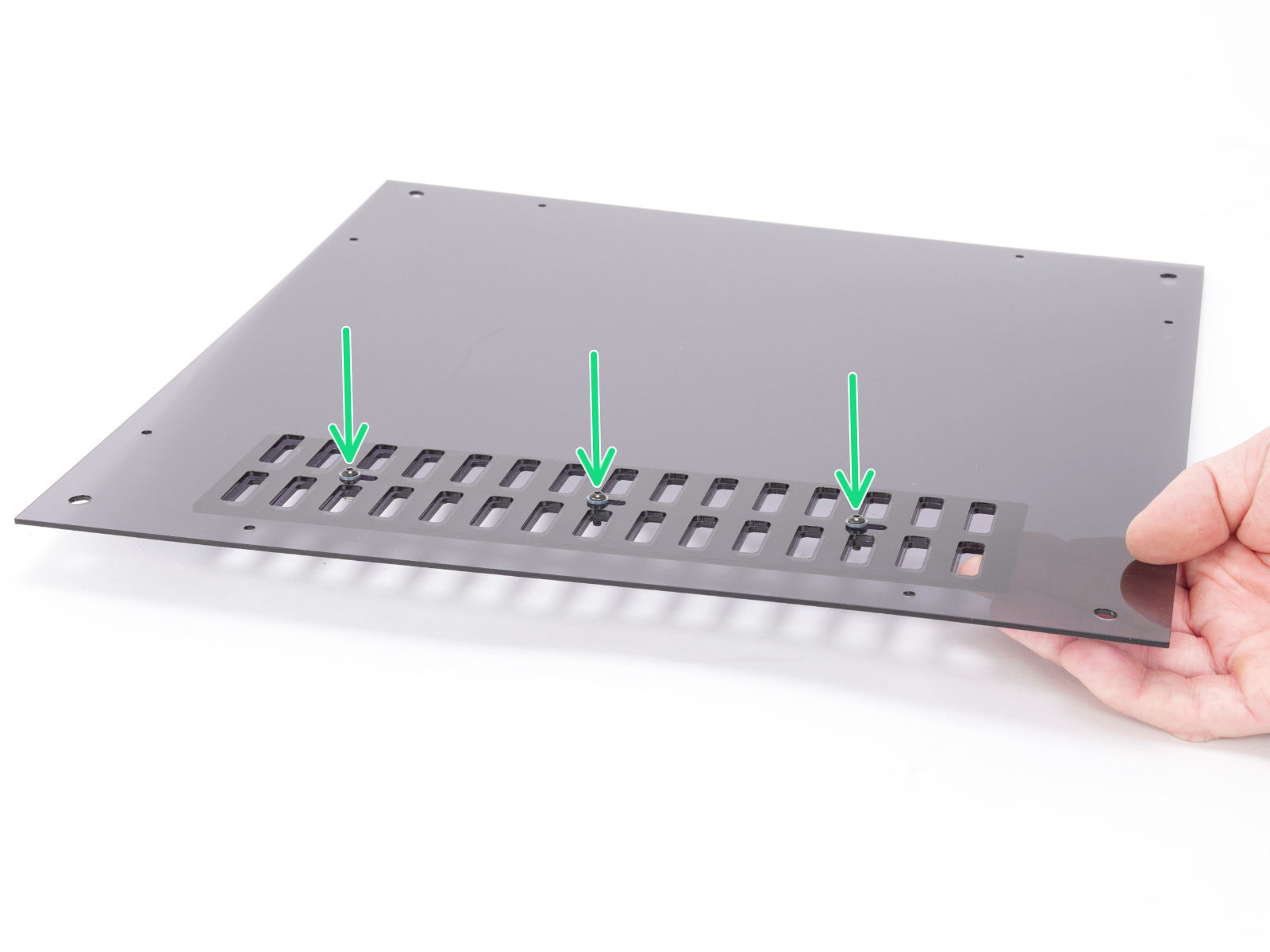 - Wsuń trzy śruby M3x10rT z podkładkami w trzy otwory w górnym panelu.