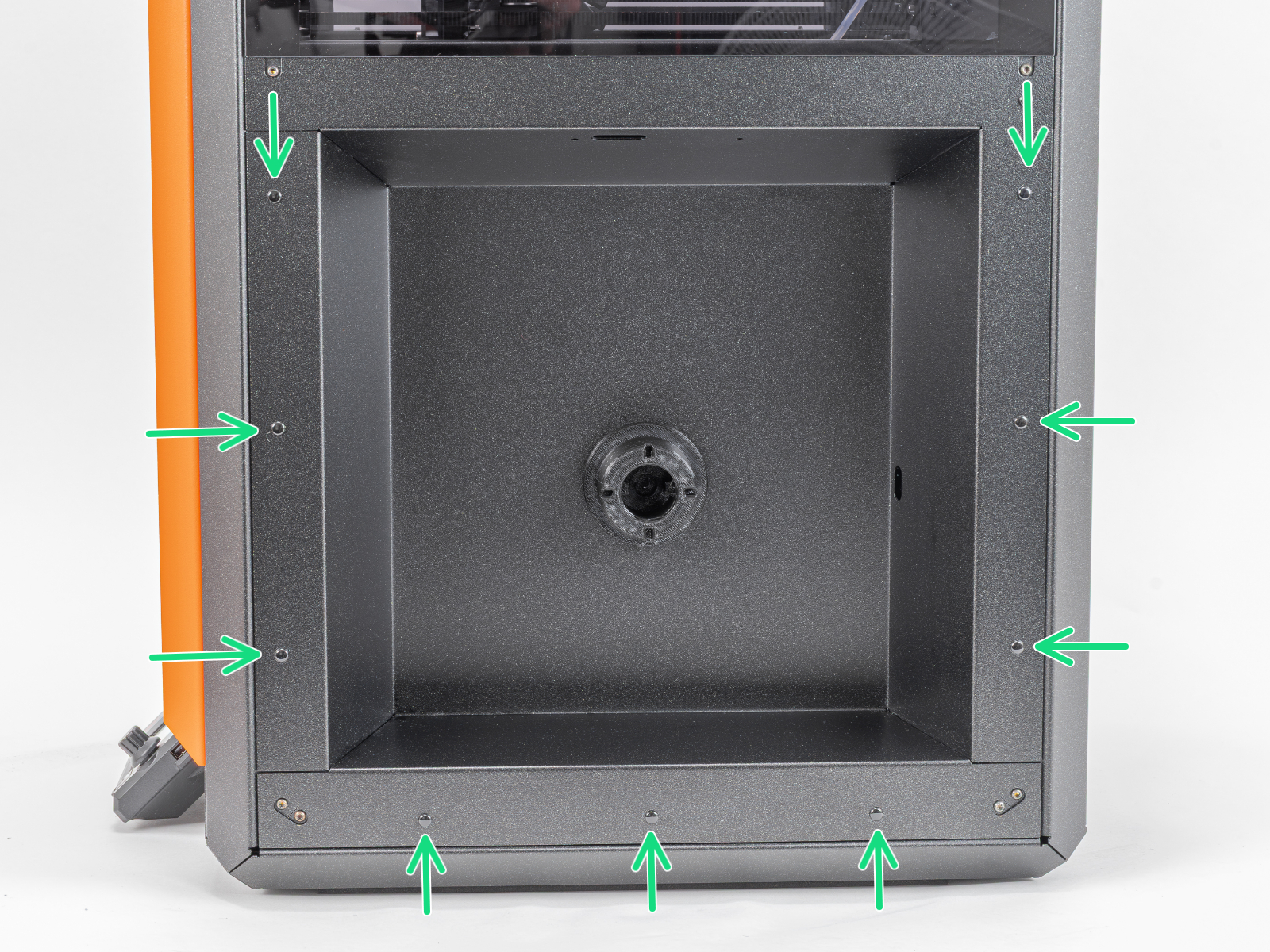 - Przyłóż prawy panel boczny z powrotem do drukarki i zamocuj go dziewięcioma nitami nylonowymi. Użyj ponownie nitów wyciągniętych z drukarki.