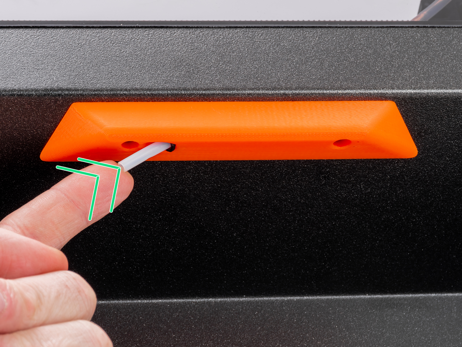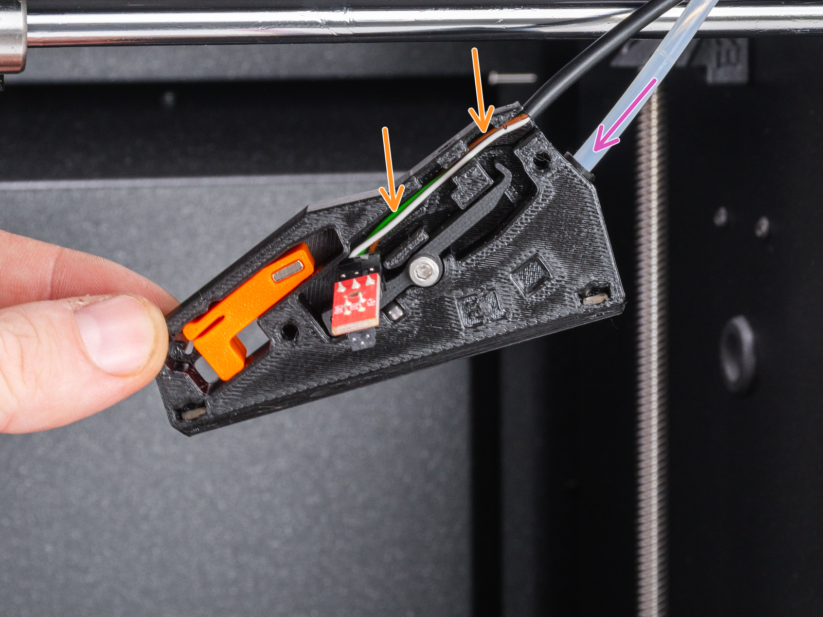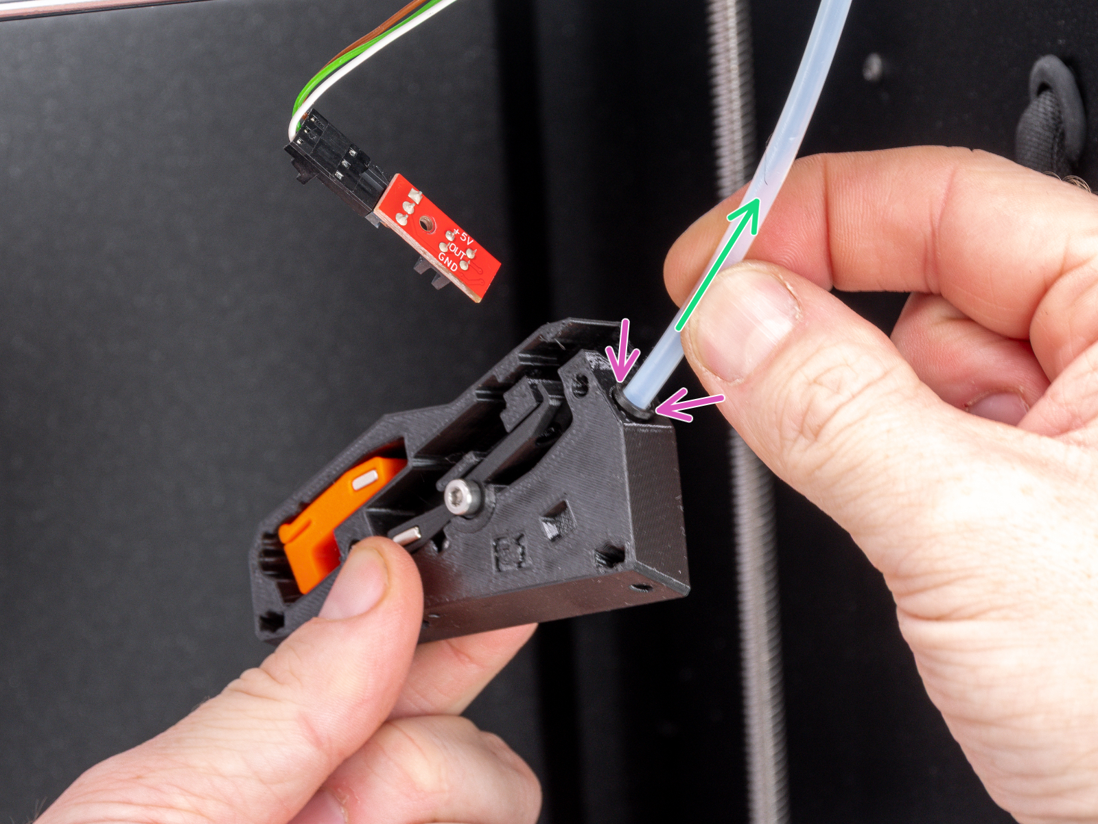 - Wsuń rurkę PTFE w tuleję zaciskową w uchwycie, aż do czujnika filamentu.