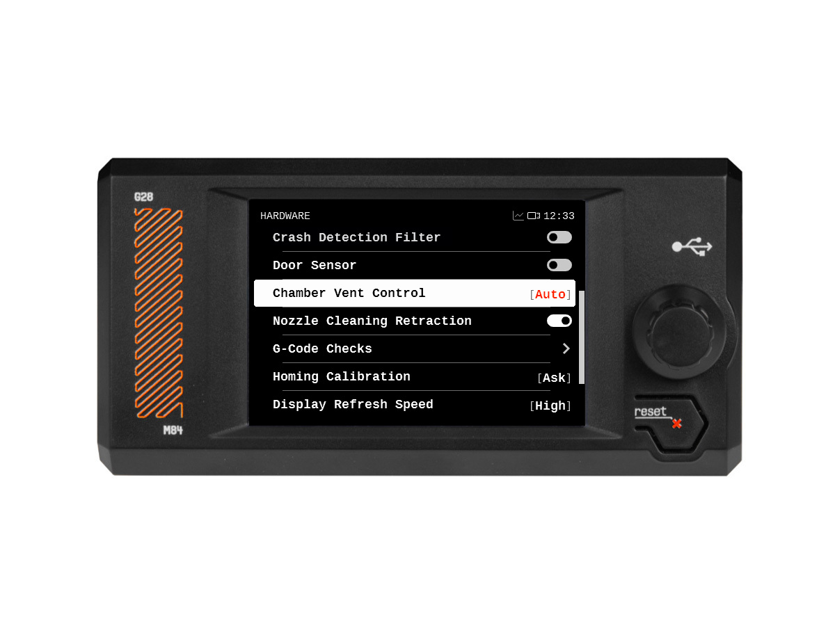 Aby włączyć automatyczne sterowanie dźwignią, przejdź do menu Ustawienia → Sprzęt → Kontrola kratki [Settings → Hardware → Chamber Vent Control] i ustaw Auto.