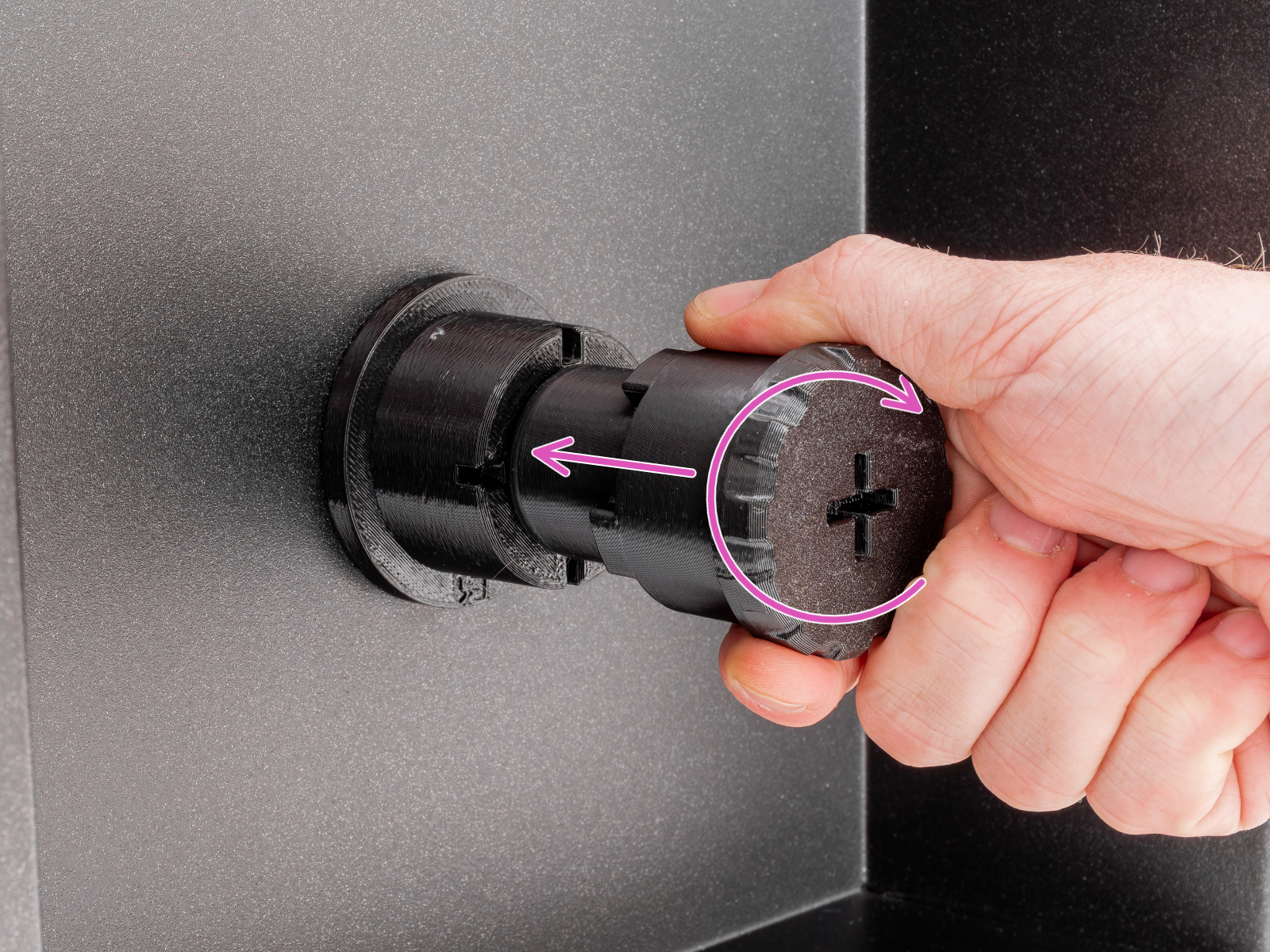 - Wciśnij czarną tuleję zaciskową do środka, aby zwolnić rurkę PTFE. Wyciągnij rurkę jednocześnie cały czas naciskając tuleję.