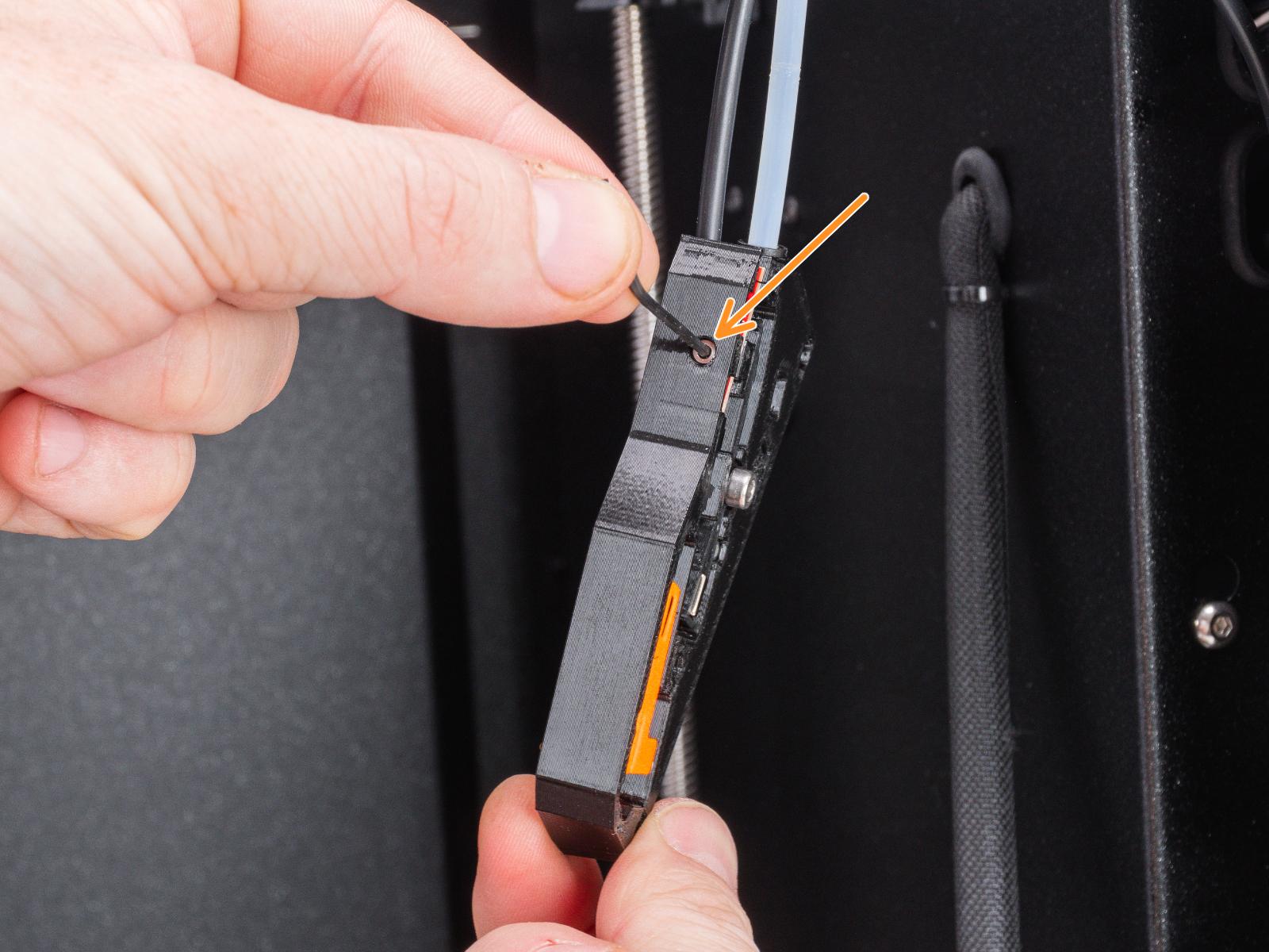 - Wsuń przewód czujnika filamentu IR w rowek. Czarne złącze powinno znajdować się mniej więcej pośrodku podstawy czujnika.