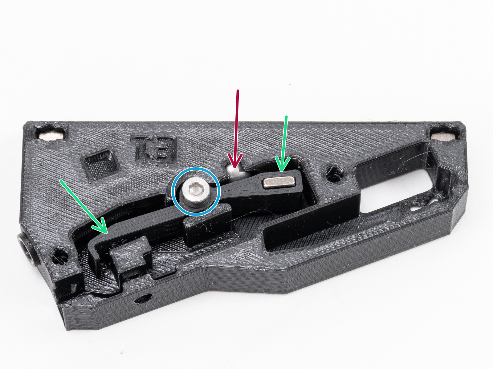 - Umieść stalową kulkę i nową dźwignię w korpusie czujnika, następnie przymocuj dźwignię śrubą M3x10. Nie dokręcaj zbyt mocno śruby - dźwignia musi się swobodnie obracać na śrubie.