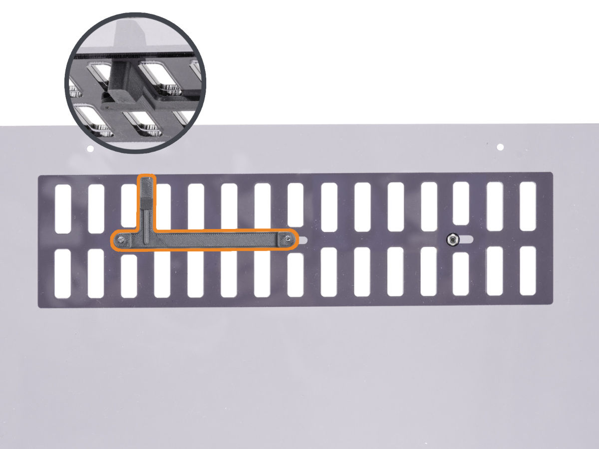 - Umieść zasuwę górnej kratki wentylacyjnej C1+ [C1+ UPG VENT BLOCK B] na śrubach i dokręć je, ale nie do końca.